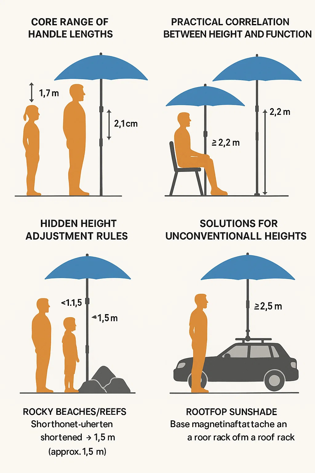 Berikut ini adalah analisis praktisnya payung pantai ketinggian, berdasarkan skenario penggunaan umum dan prinsip desain ergonomis: