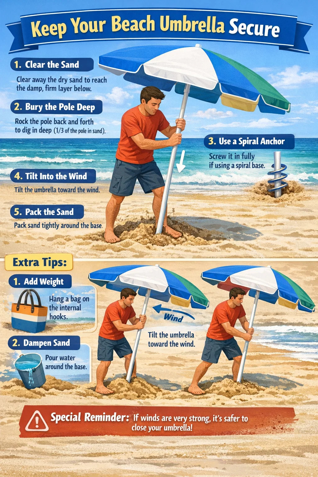 Jika pasir terlalu kering, tuangkan seember air laut di sekitar pangkal payung. Pasir yang dibasahi akan berfungsi seperti semen, “mencengkeram” tiang payung lebih erat.