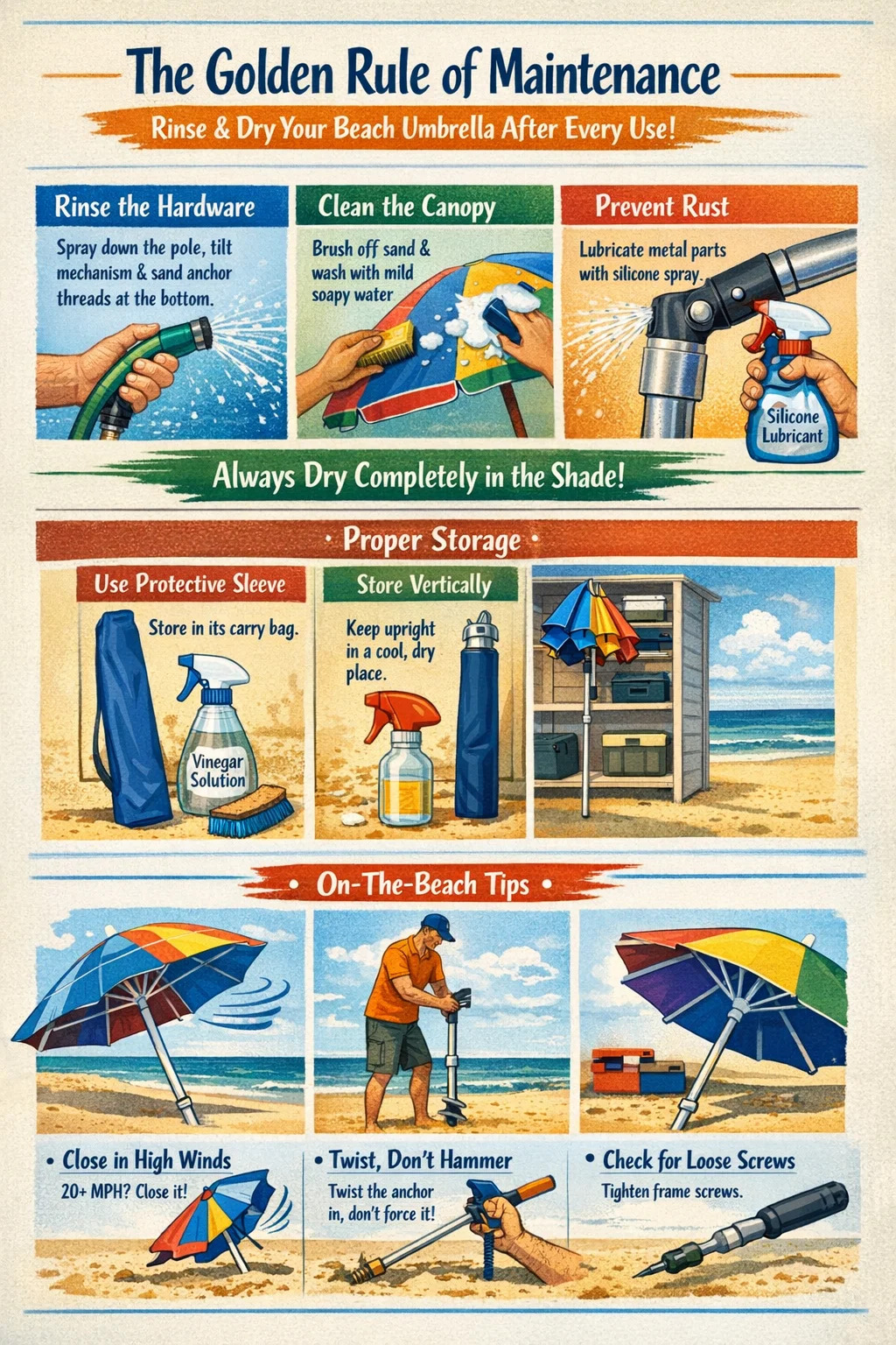 Ketika Anda kembali dari pantai, Anda payung pantai ditutupi kristal garam mikroskopis dan pasir abrasif. Jika dibiarkan, partikel-partikel ini memerangkap kelembapan dan menyebabkan jamur atau kerusakan mekanis.
