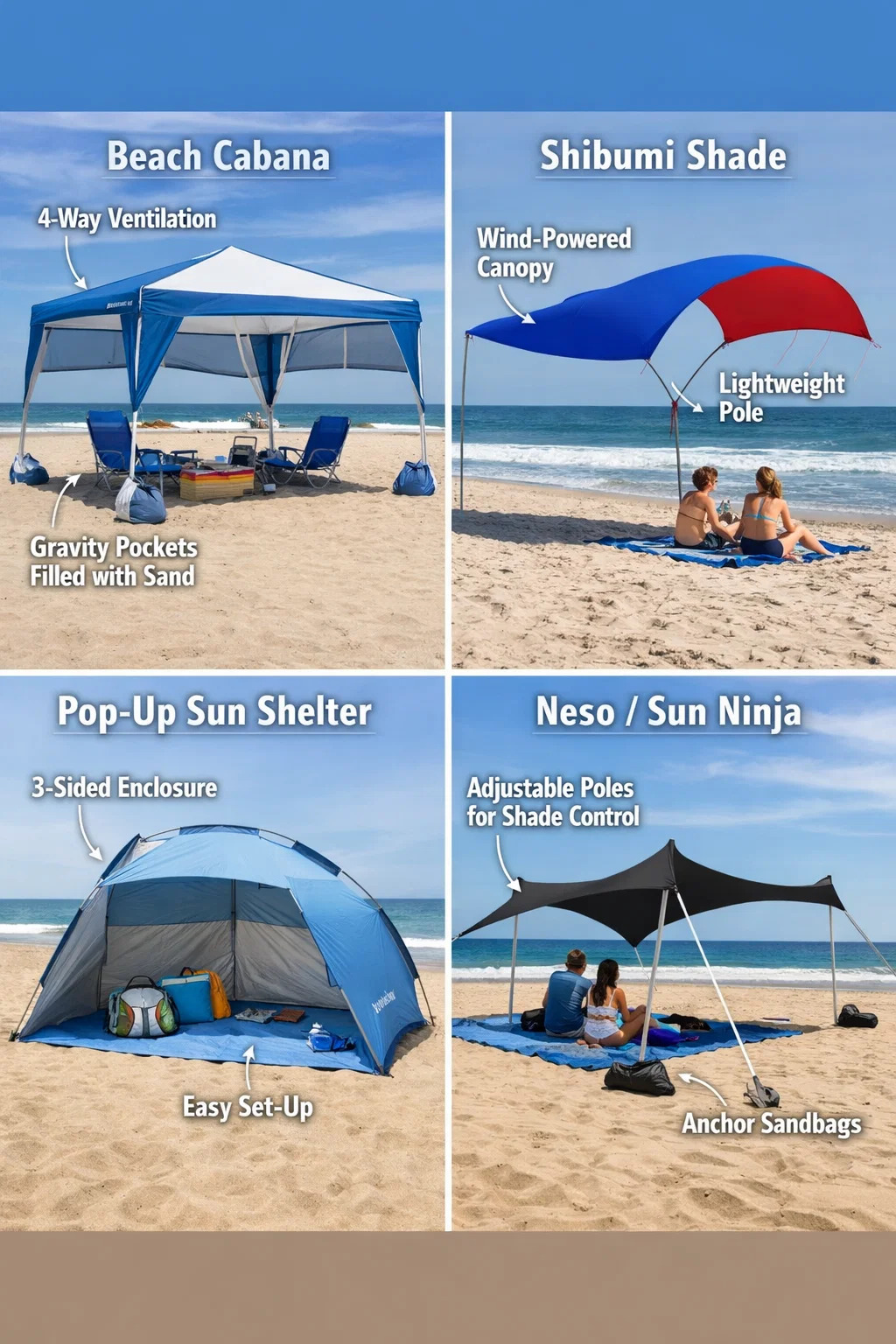Mengapa lebih baik: Produk-produk ini biasanya ditutup pada tiga sisi, seperti setengah tenda. Bagi mereka yang memiliki anak-anak atau hewan peliharaan, produk ini menghalangi angin, pasir, dan sinar UV dari samping, memberikan perlindungan matahari yang lebih komprehensif.