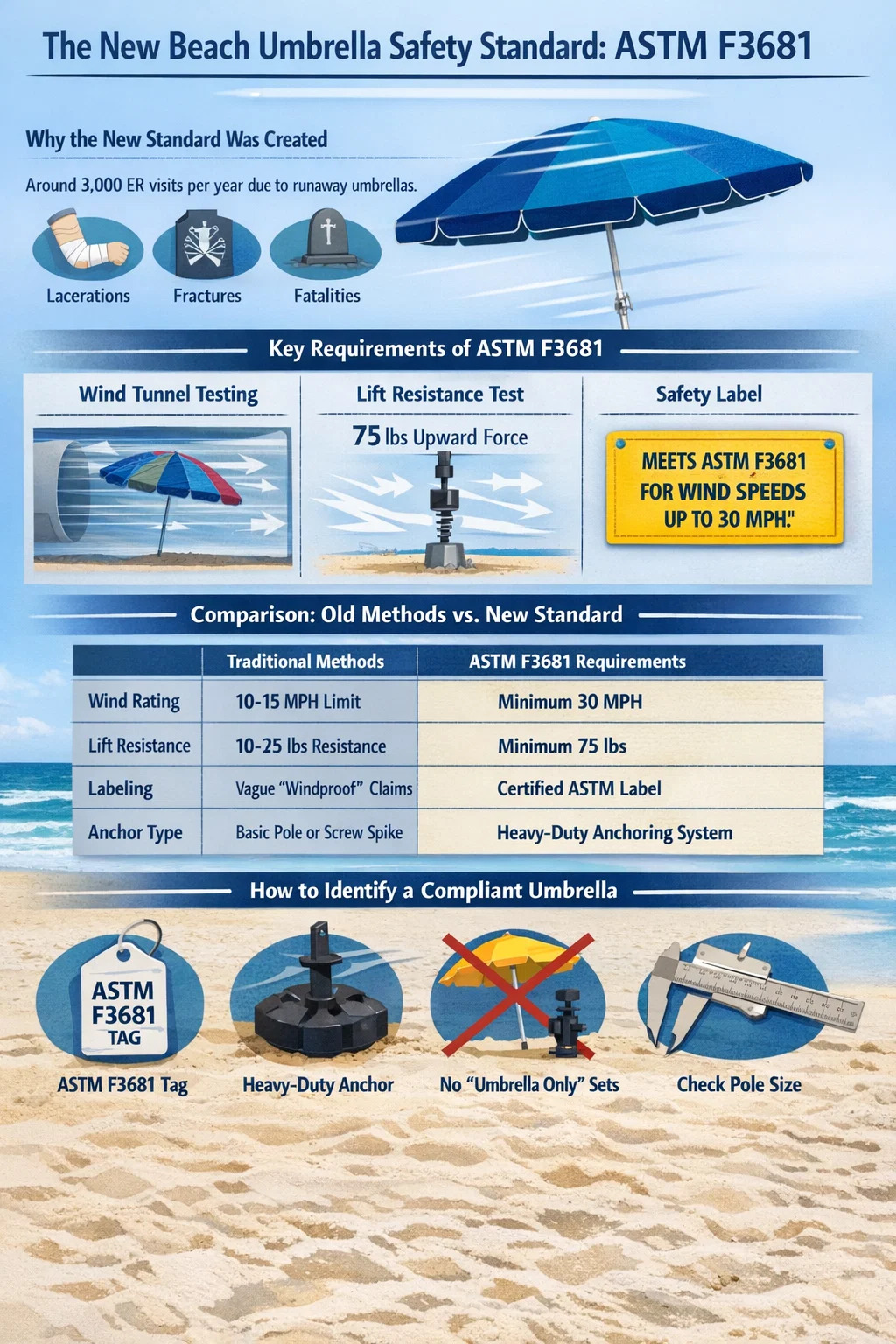 Selama beberapa dekade, desain payung pantai sebagian besar dibiarkan tidak diatur, menyebabkan ribuan cedera setiap tahunnya. Data dari Komisi Keamanan Produk Konsumen (CPSC) menunjukkan bahwa sekitar 3.000 orang dirawat di ruang gawat darurat setiap tahunnya karena cedera akibat payung yang lepas. Insiden-insiden ini sering kali membuat payung menjadi proyektil berbahaya dalam hembusan angin yang tiba-tiba, menyebabkan luka robek, patah tulang, dan bahkan kematian. Standar ASTM F3681 dikembangkan untuk memaksa pergeseran dalam industri menuju mekanisme penahan yang teruji secara ilmiah.