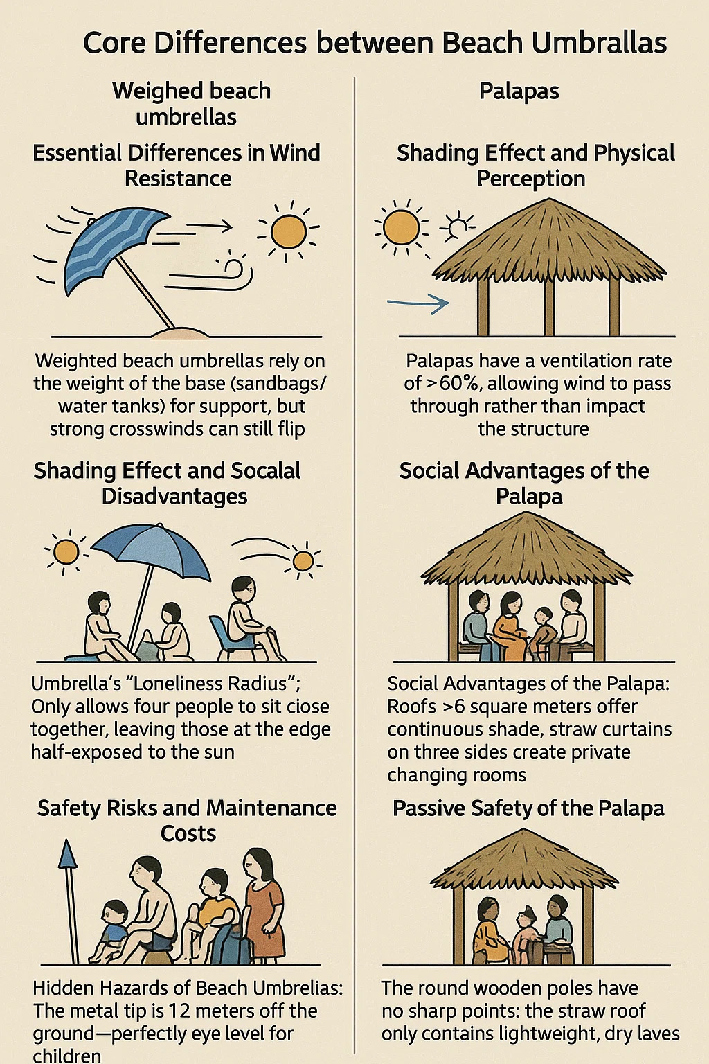Batasan perlindungan sinar matahari payung pantai: Naungan di bawah payung bergeser seiring dengan sudut matahari, sehingga memerlukan penyesuaian yang sering. Lapisan perak memantulkan radiasi panas dari tanah secara tidak efisien, sehingga bahkan pada siang hari ketika permukaan pasir bersuhu 60°C, suhu di bawah payung masih bisa melebihi 40°C. Palapas menawarkan pendinginan alami: Daun palem yang menebal menyerap panas dibandingkan memantulkannya, menjaga tingkat kelembapan konstan (diukur di pantai, 3-5°C lebih rendah dibandingkan di bawah payung); kerai penuh tidak memerlukan penyesuaian.